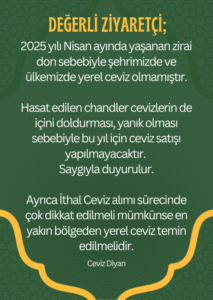 Ceviz Diyarı Kooperatifi olarak ceviz üretici çiftçilerimizin yetiştirmiş olduğu Kahramanmaraş yöresinde yüksek rakımlarda yetişen Maraş 18 Cevizini “üreticiden halka” anlayışı ile sofranızda buluşturmak için var gücümüzle çalışıyoruz.